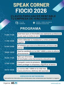 Bajo el título “Claves para hacer rentable tu empresa de hinchables”, el Speak Corner FIOCIO 2026 ofrecerá un programa técnico y práctico diseñado para dotar a los profesionales del sector de herramientas que impulsen la profesionalización, seguridad y rentabilidad de sus negocios.
